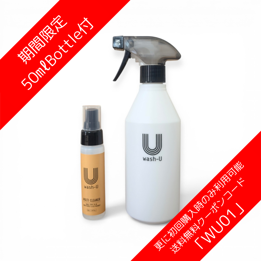 「wash-U」の新しい環境負荷軽減の500mlボトル1本に、持ち運びし易いミニスプレーボトル50mlを1本プレゼント。